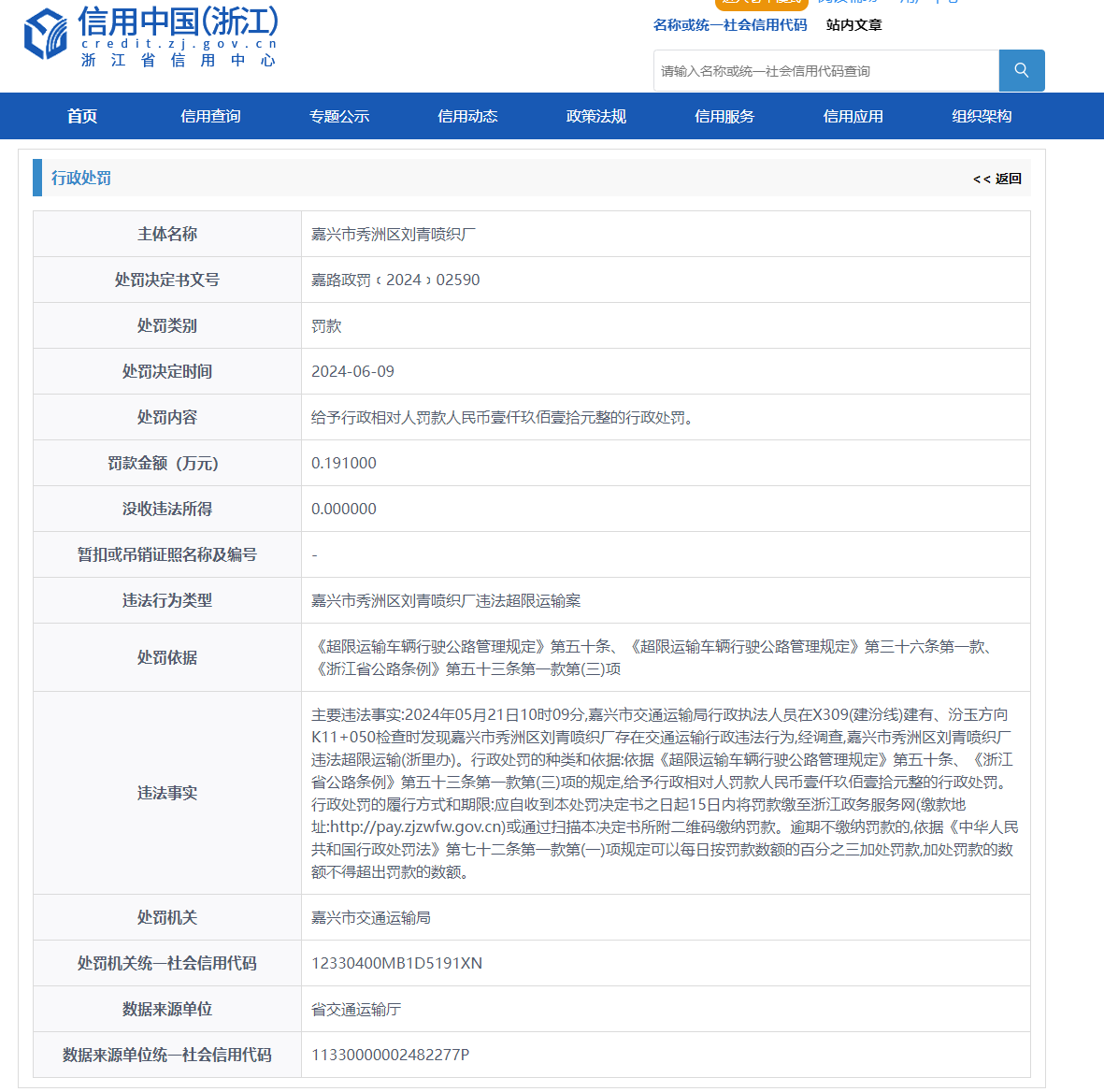 消息,近日,嘉兴市秀洲区刘青喷织厂因违法超限运输案,被嘉兴市交通运输局给予行政相对人罚款人民币1910元整的行政处罚。